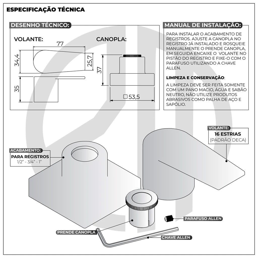 • Compatibilidade Universal: Projetado para registros de pressão e gaveta padrão Deca e Docol, este acabamento é altamente versátil e se adapta perfeitamente à maioria dos sistemas de encanamento.