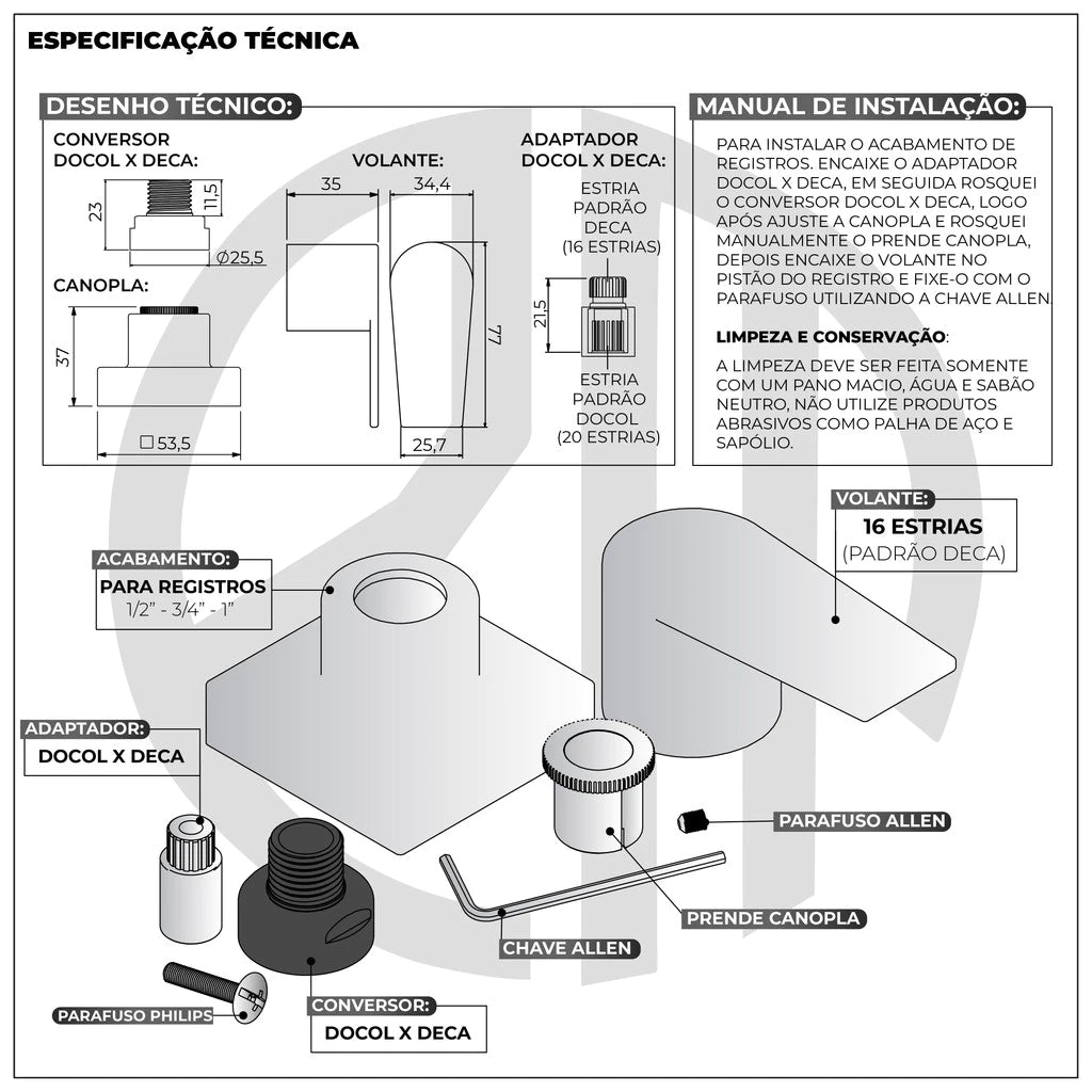 - Compatibilidade Universal: Projetado para registros de pressão e gaveta padrão Deca de 16 estrias, este acabamento é altamente versátil e se adapta perfeitamente à maioria dos sistemas de encanamento.