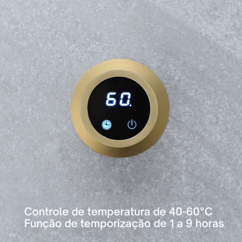 Ajuste preciso da temperatura entre 40°C e 60°C, com interface touch intuitiva e visualização clara no display LED.