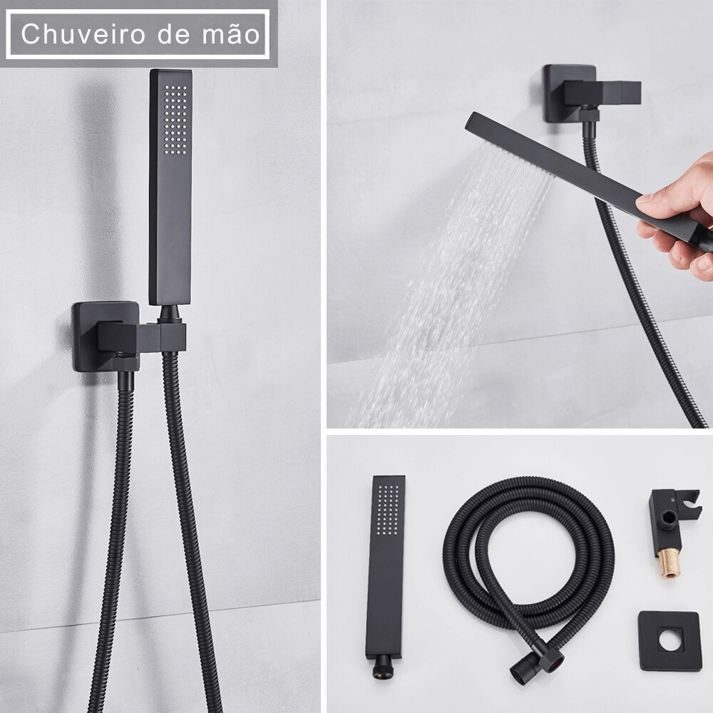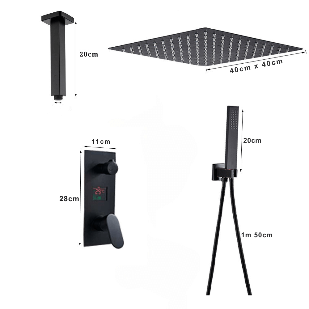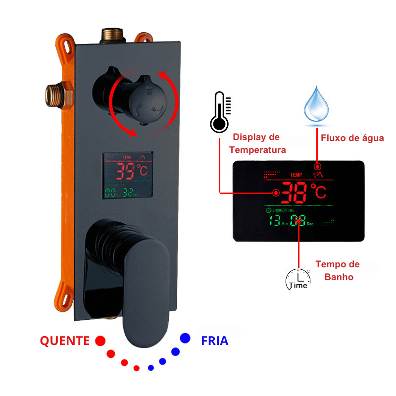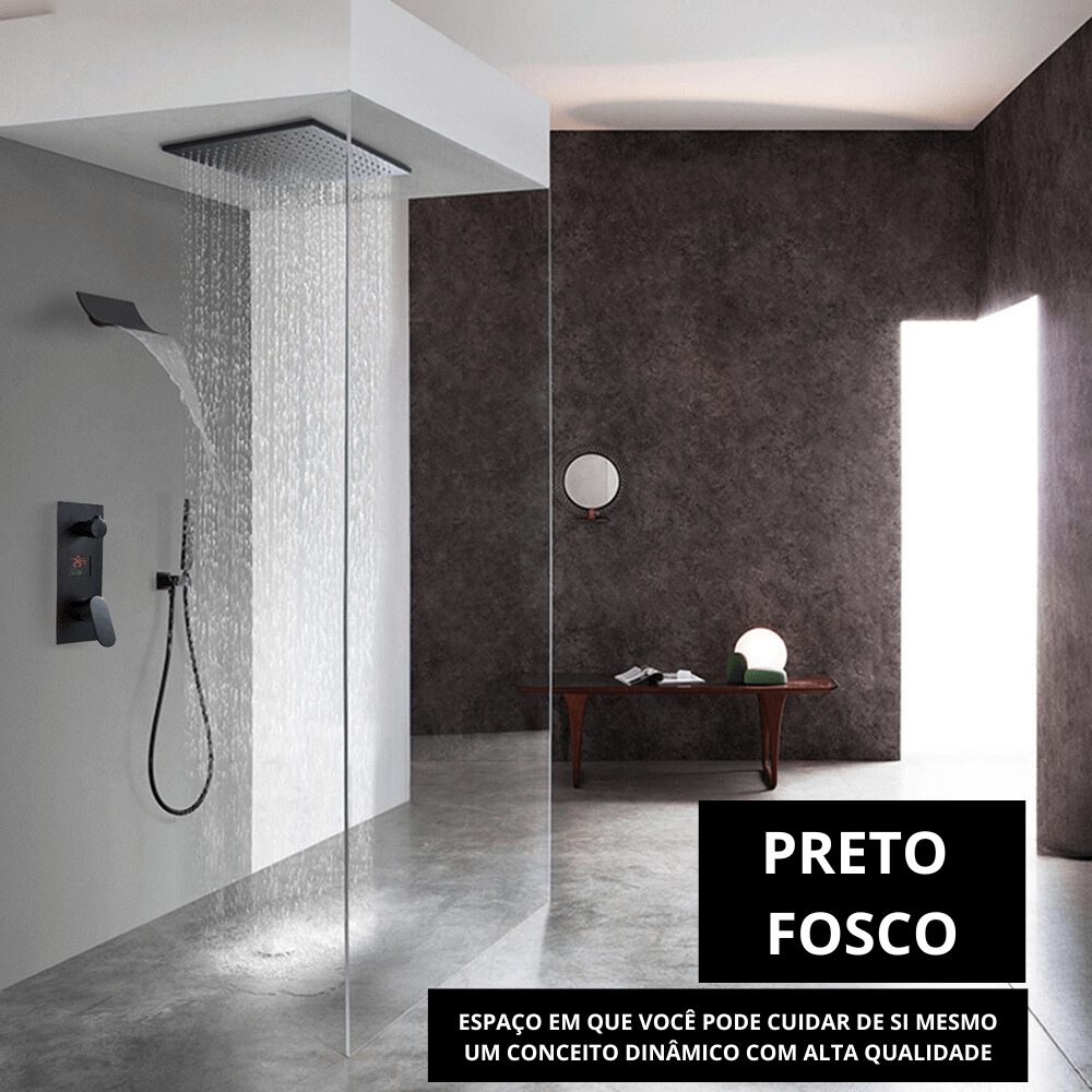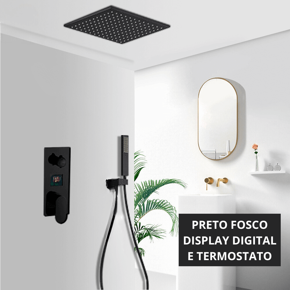 O Display Digital com Termostato do Chuveiro de Chuva Rainfall garante a temperatura da água perfeita para o seu banho, proporcionando conforto e economia.