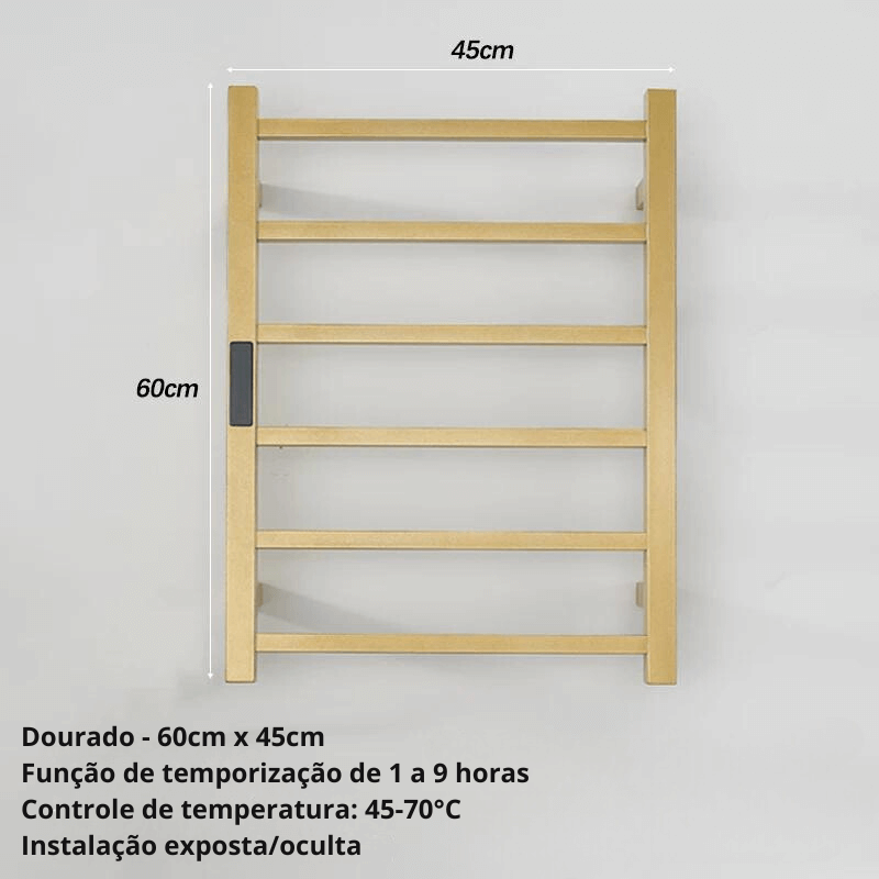 Design elegante e versátil: O Toalheiro Térmico adiciona sofisticação e elegância ao ambiente, além de proporcionar aquecimento eficiente para suas toalhas. O revestimento dourado também contribui para um design moderno e luxuoso, transformando seu banheiro em um espaço mais acolhedor e estiloso.